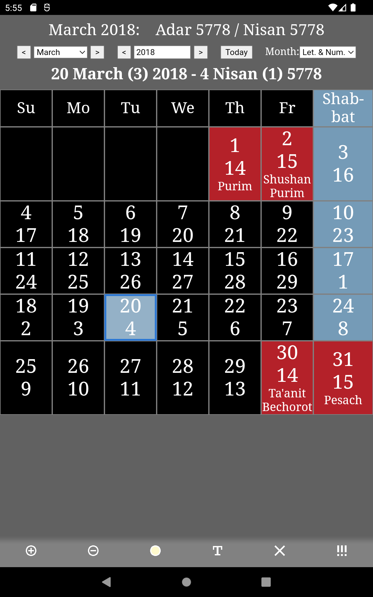Календарь отображает еврейские праздники и посты и содержит конвертер дат. Интерфейс календаря кликабельный. С помощью него можно определить дату своего рождения по еврейскому календарю и узнать, какие праздники отмечают евреи и когда.